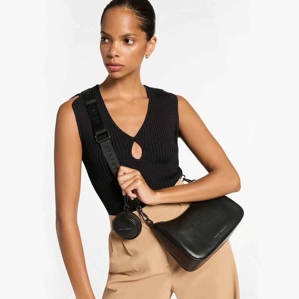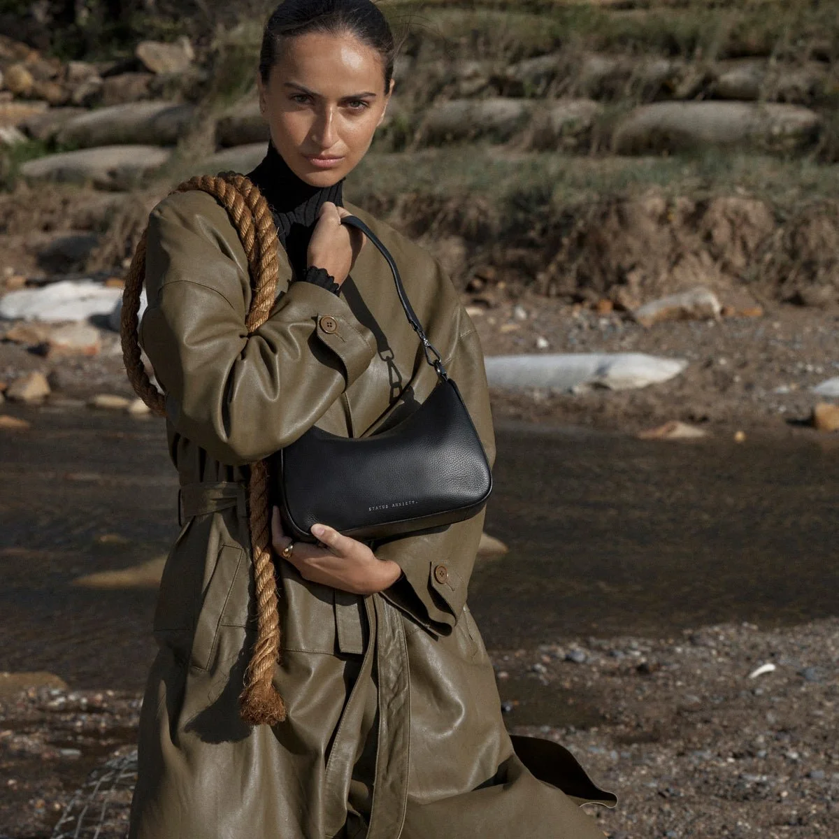 A super-chic addition to B. May’s line for Fall ‘23, this under the shoulder bag has a single flat leather strap and zippered closure. Baguette-style, small but fits all the essentials for day to day or a night out. Lined in blue suede, dust bag included.
