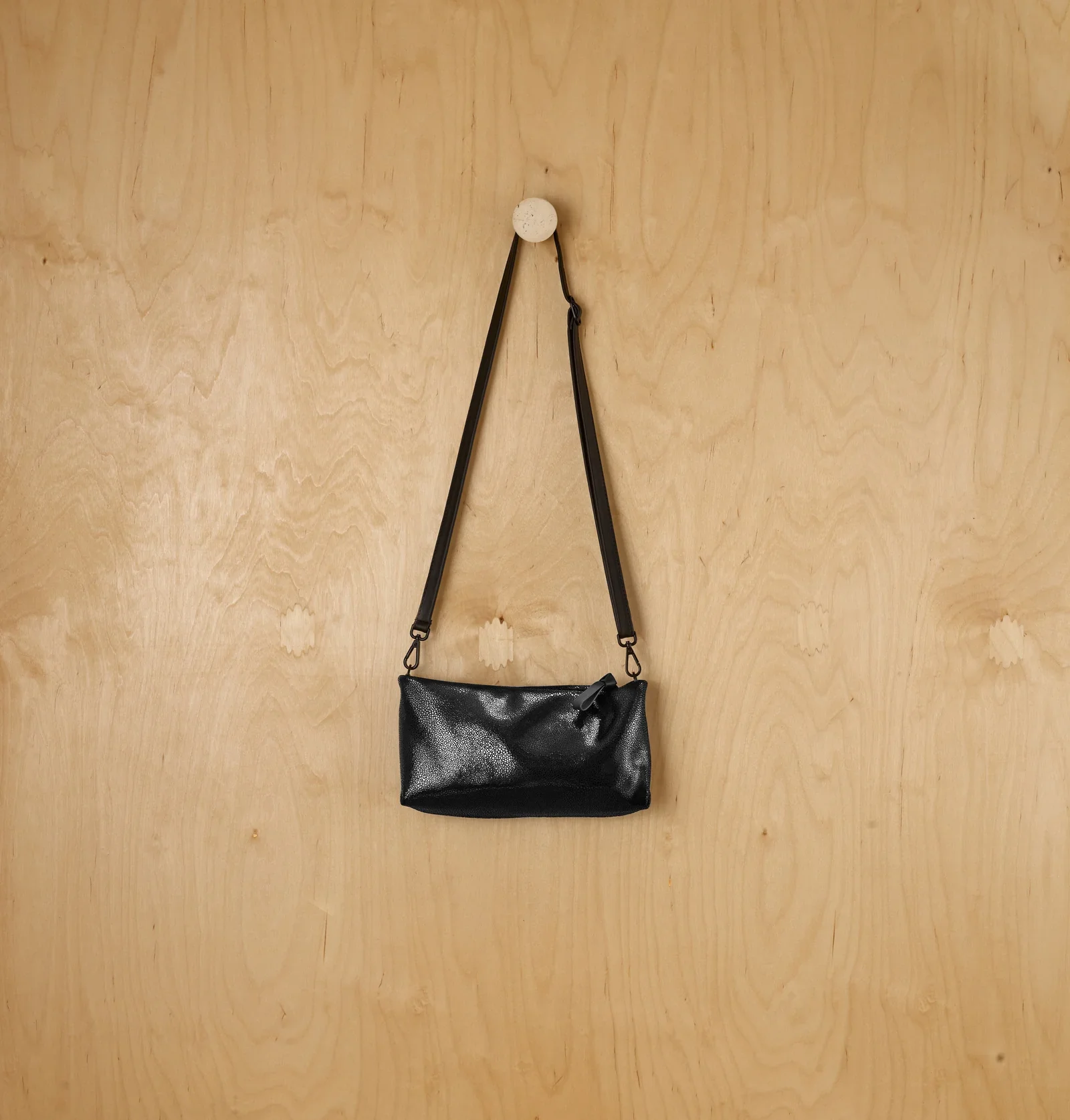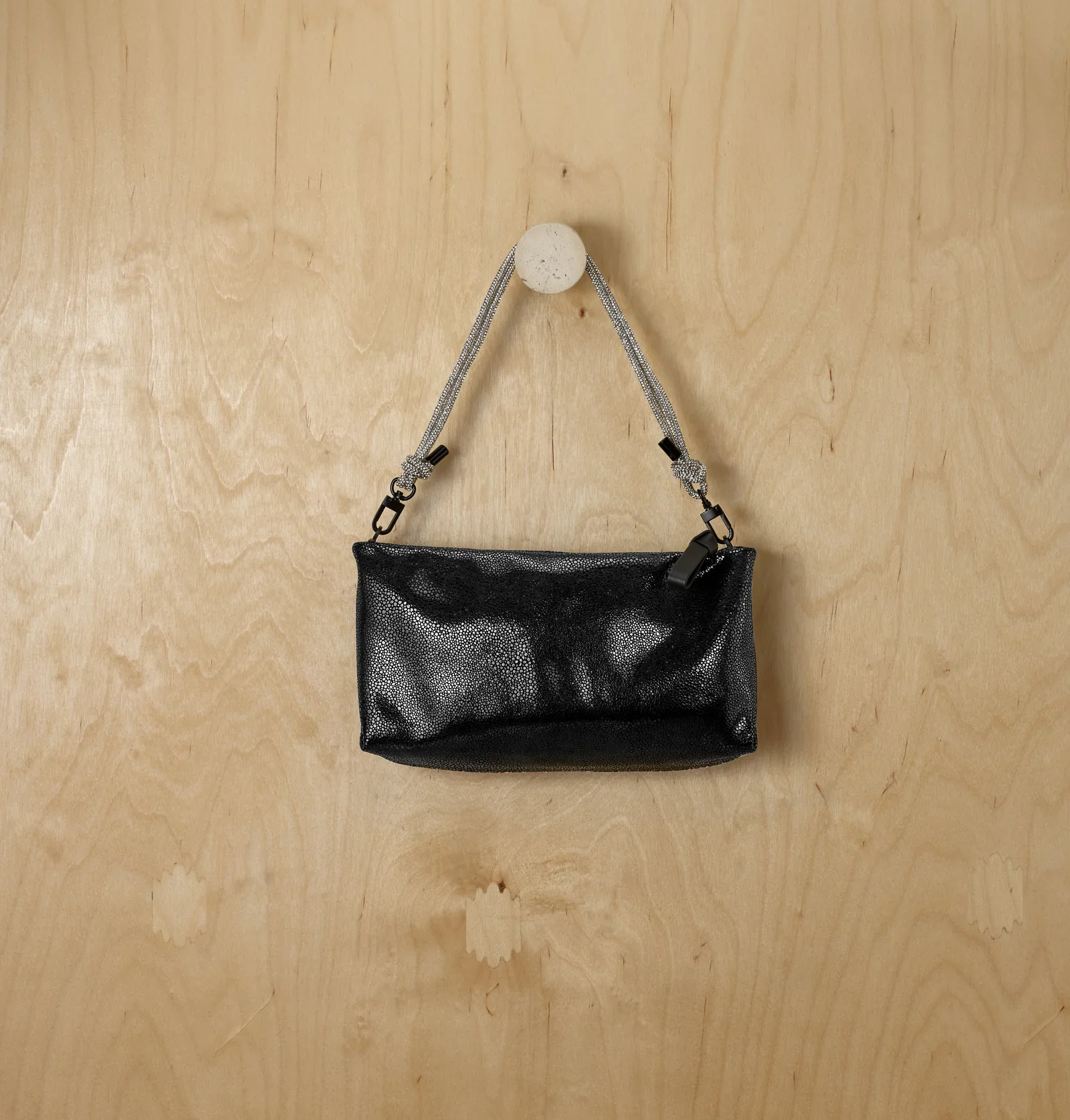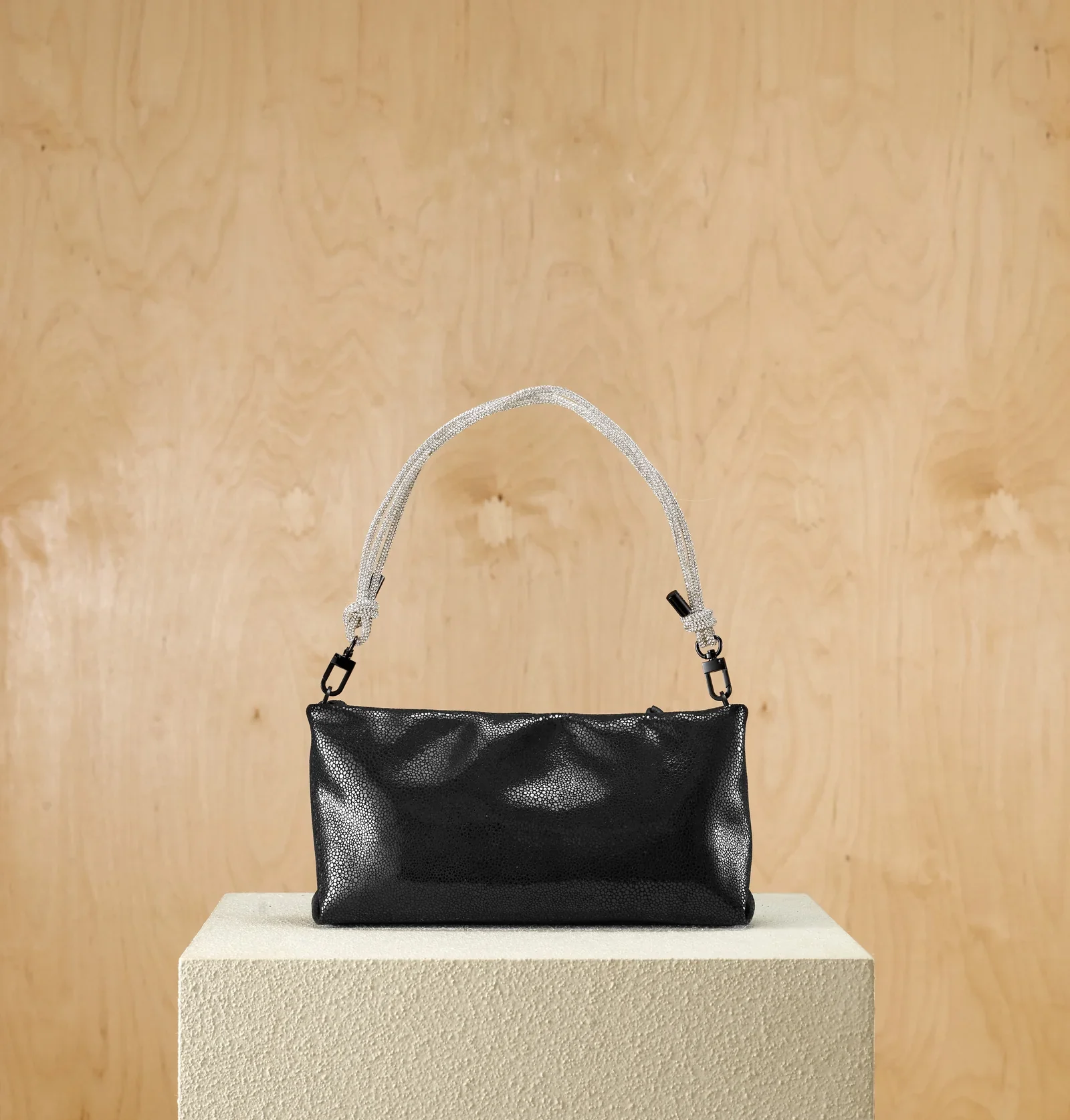 The Eve Clutch pairs soft leather with a crystal-accented handle for an elegant, festive touch. Its gathered silhouette drapes naturally around the wrist, creating a refined, organic shape. A slim chain strap offers the option to wear it crossbody, blending seamlessly into the design for effortless versatility.