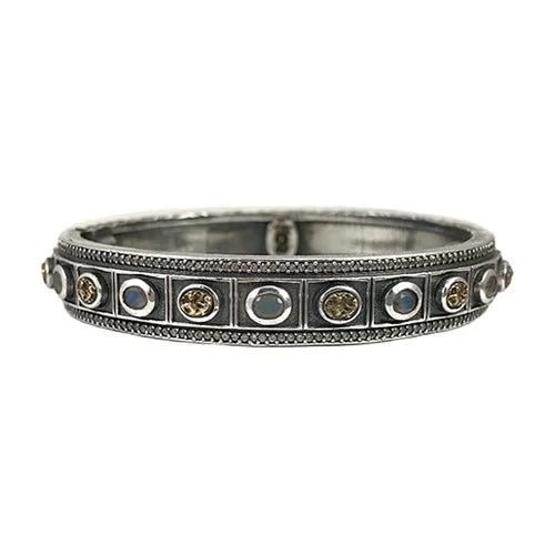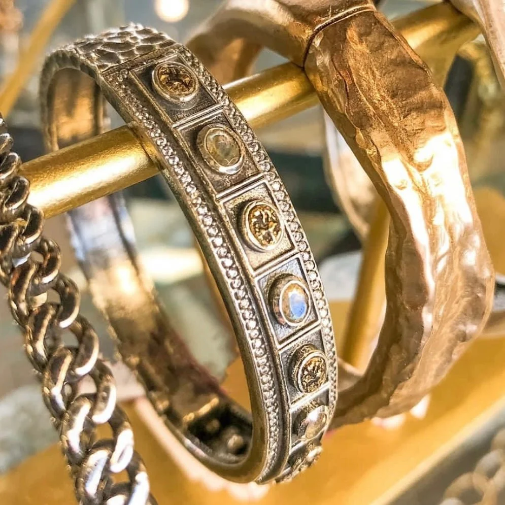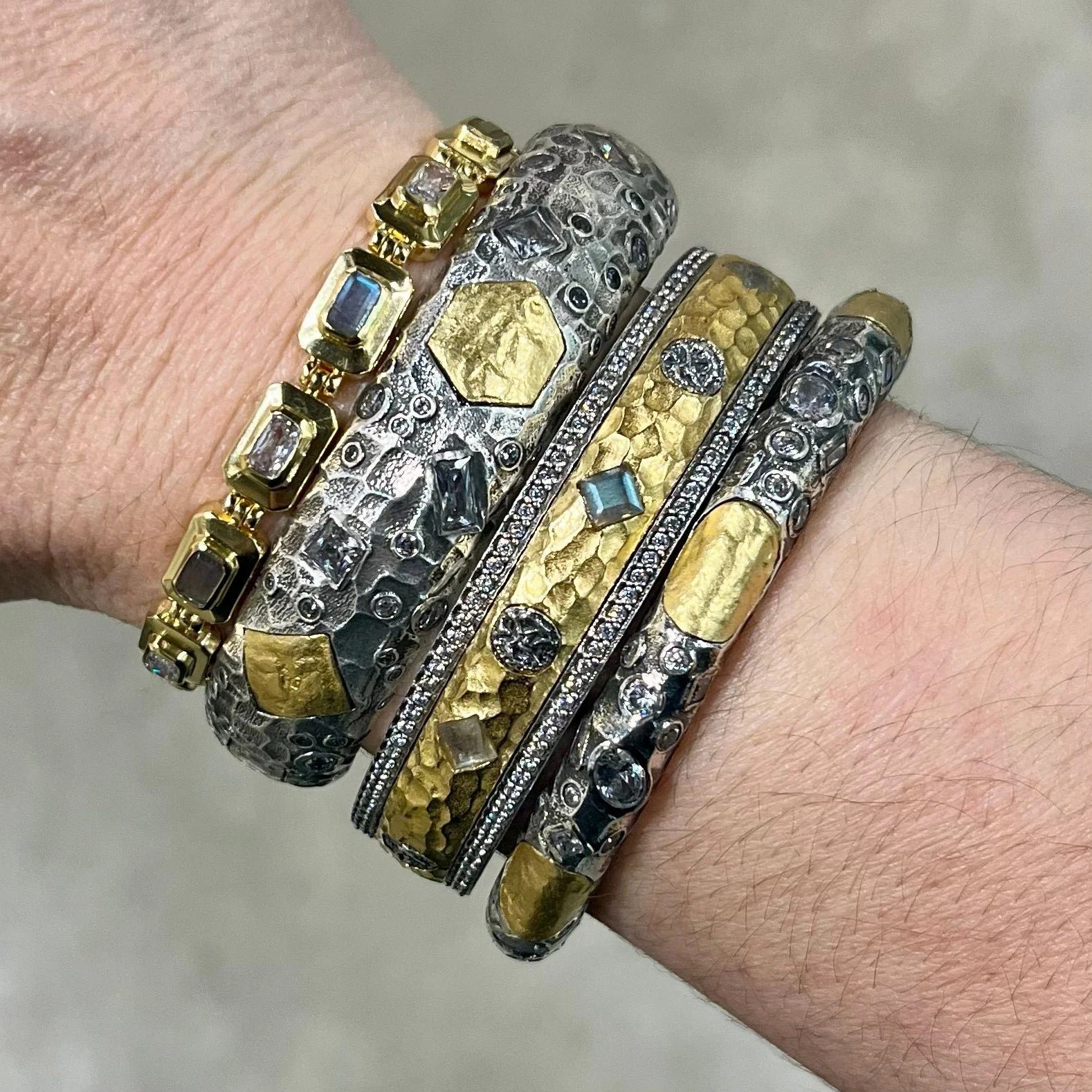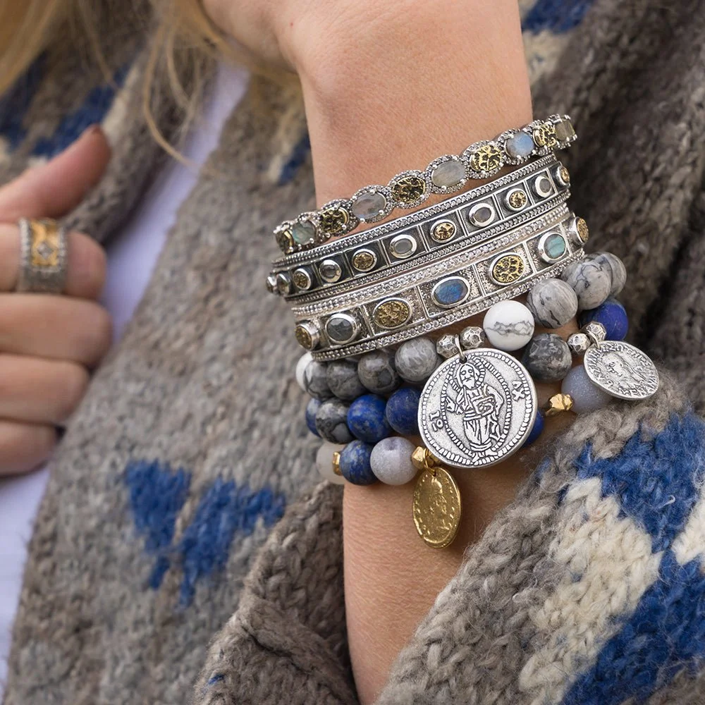 This bangle is a stunning fusion of vintage charm and modern elegance. Crafted from sterling silver plating over brass, this bangle features custom cut faceted labradorite oval stones that capture light beautifully, showcasing their natural iridescence. Adorned with 14K gold plated coin fragments and complemented by hammer and prong set cubic zirconia, this piece radiates sophistication. Designed with a magnetic closure, it offers effortless wear and a secure fit, while its 2 1/2" inside diameter ensures comfort and style for any occasion.
