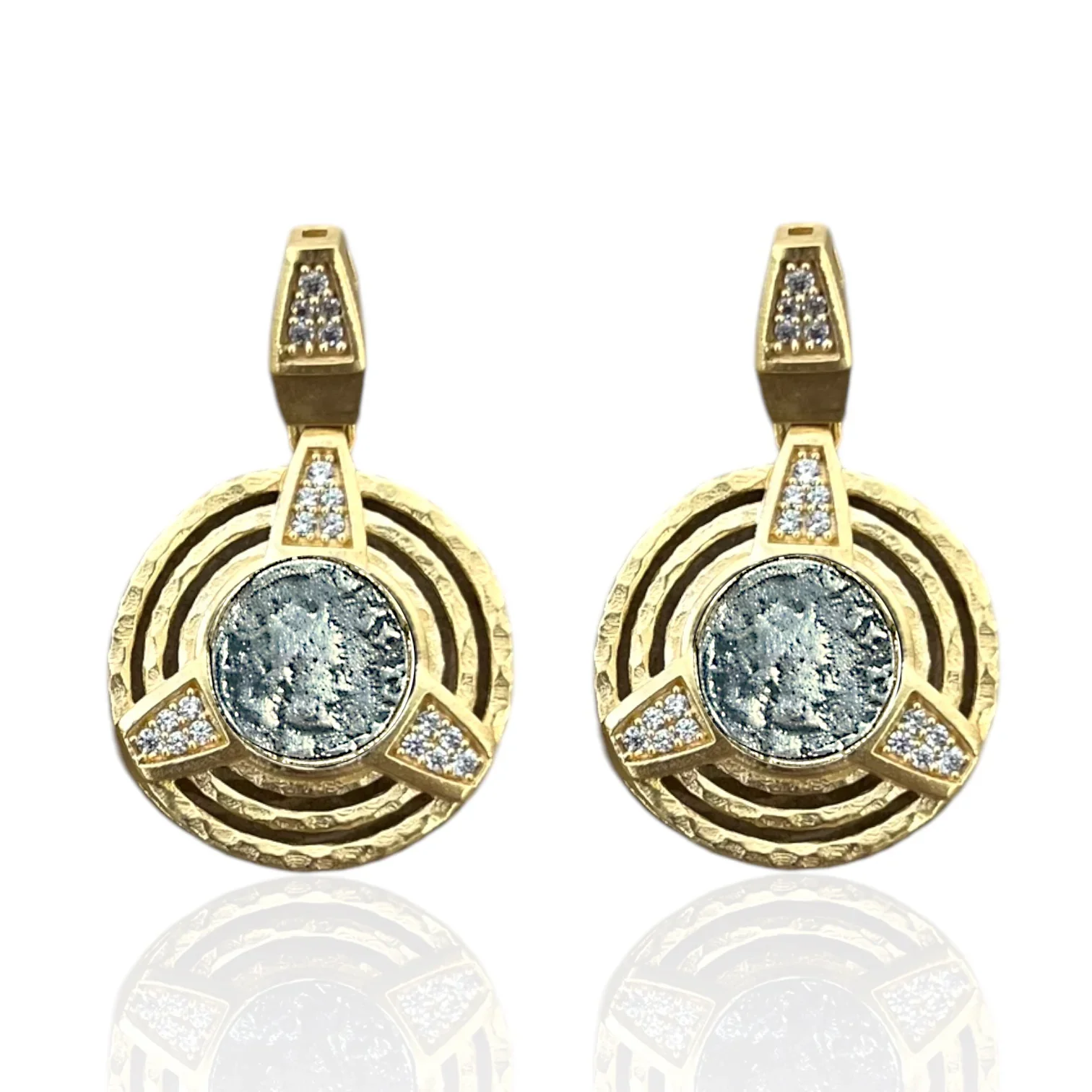 The Gold Enzo Bangle blends rich texture with mixed-metal detail for a striking, everyday statement. Crafted with a 14K gold-plated hammered finish, this oval bangle is accented with sterling silver–plated replica coins and subtle pavé cubic zirconia for a touch of sparkle. A spring hinge with a magnetic closure ensures an easy, secure fit, while the 6.5mm profile offers the perfect balance of boldness and wearability.